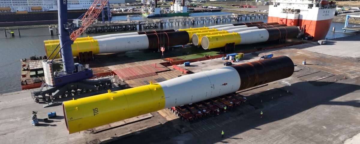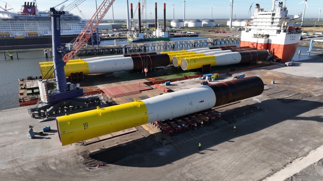 First foundations for RWE’s Danish offshore wind farm Thor arrive at Eemshaven port