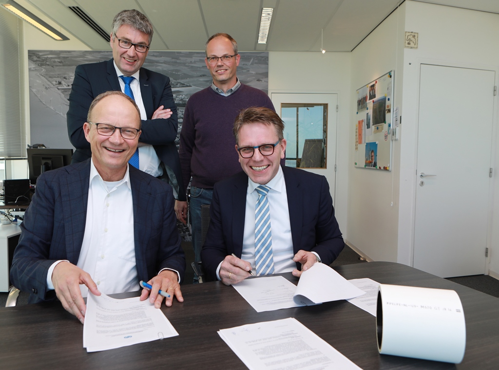 In front CEO Mark van Loon of Pipelife (l) and Cas König of Groningen Seaports (r) are signing the cooperation agreement. At the back Eertwijn van den Dool (l) and Herbert Colmer (r) of Groningen Seaports.