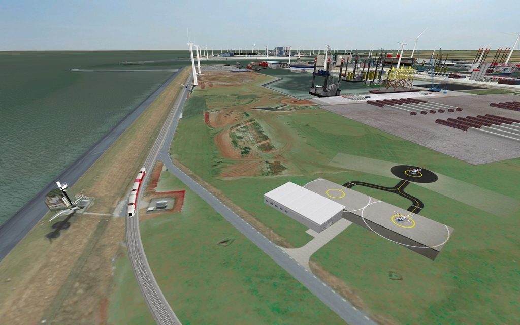 The preparations for building the infrastructure for the heliport in Eemshaven have started. The contract documents for building the basic infrastructure have now been put out for tender, and the award of the contract is planned for the end of April. The artist impression has been adapted on the basis of the contract drawing. The basic premise is now a central starting and landing place and two stands (where the helicopters are parked).