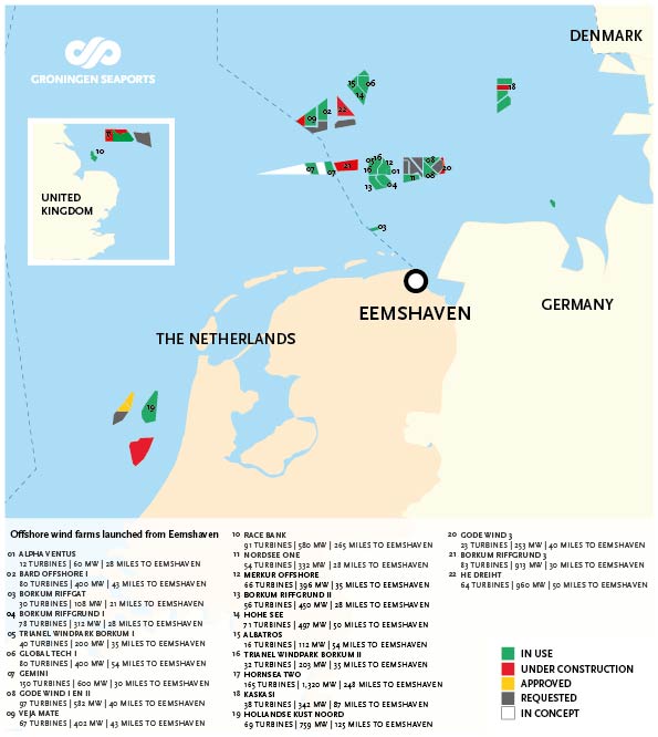 Sinds 2009 speelt de Eemshaven een belangrijke rol met betrekking tot de assemblage en de logistieke afhandeling van windturbines, wat geleid heeft tot een indrukwekkend trackrecord van windparken die via de Eemshaven zijn aangelegd: achtereenvolgens Alpha Ventus, Bard Offshore I, Borkum Riffgat, Borkum Riffgrund I, Trianel Windpark Borkum I, Global Tech I, Gemini, Gode Wind I & II, Veja Mate, Race Bank (UK), Nordsee One, Merkur Offshore, Borkum Riffgrund II, Hohe See, Albatros, Trianel Windpark Borkum II, Hornsea Two (’s werelds grootste windpark op zee met 165 turbines), Kaskasi, Hollandse Kust Noord, Gode Wind III, Borkum Riffgrund III en He Dreiht. Momenteel accommodeert de Eemshaven de aanleg van het Deense windpark Thor, het 23e project dat via de Eemshaven verloopt. Verder zijn er in de nabije toekomst nog vele offshore windparken, waarvoor de Eemshaven als basis- of servicehaven zou kunnen fungeren, gepland.