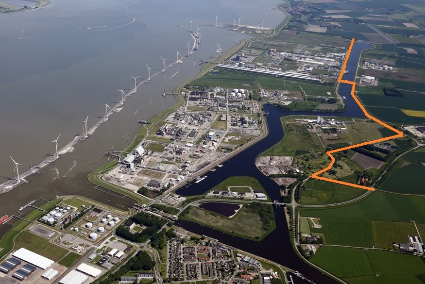 Op bovenstaande foto van het industrieterrein Oosterhorn in Delfzijl geven de oranje lijnen de alternatieve fietsroute weer