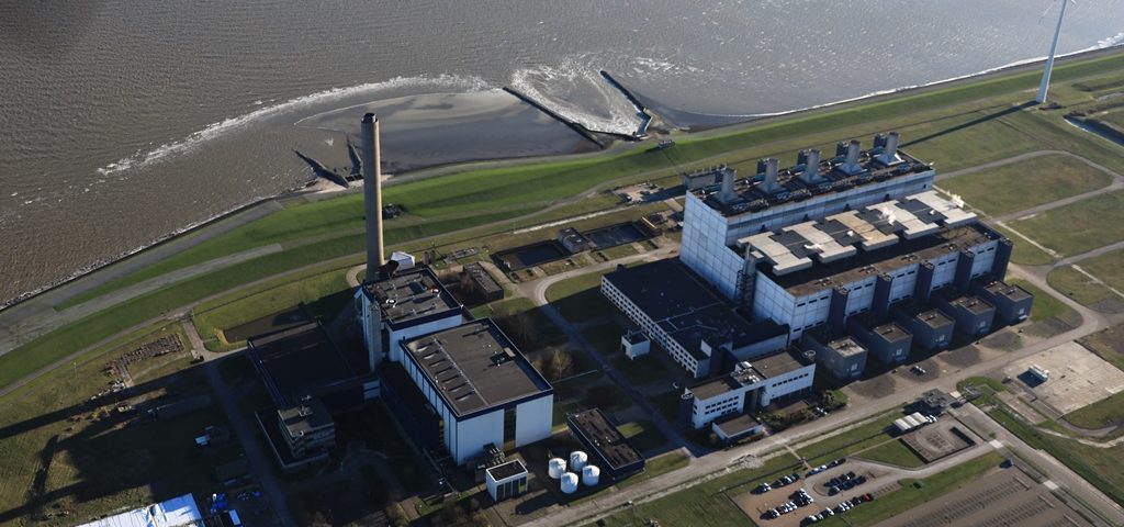 De gasgestookte energiecentrale van ENGIE in de Eemshaven met linksonder de algenteelt locatie van Omega Green