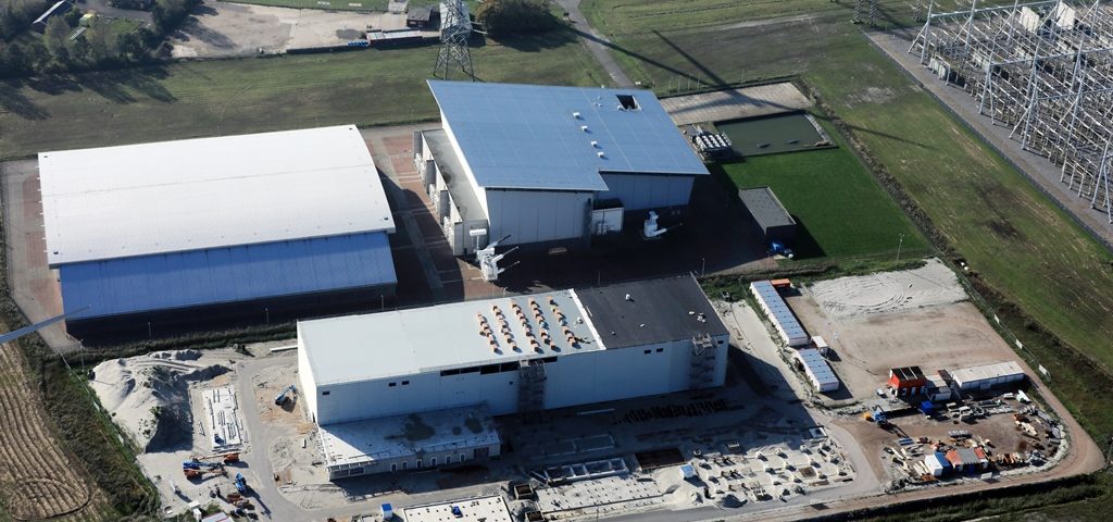 Op de voorgrond het in aanbouw zijnde COBRA converterstation op een locatie direct naast het converterstation van NorNed in de Eemshaven