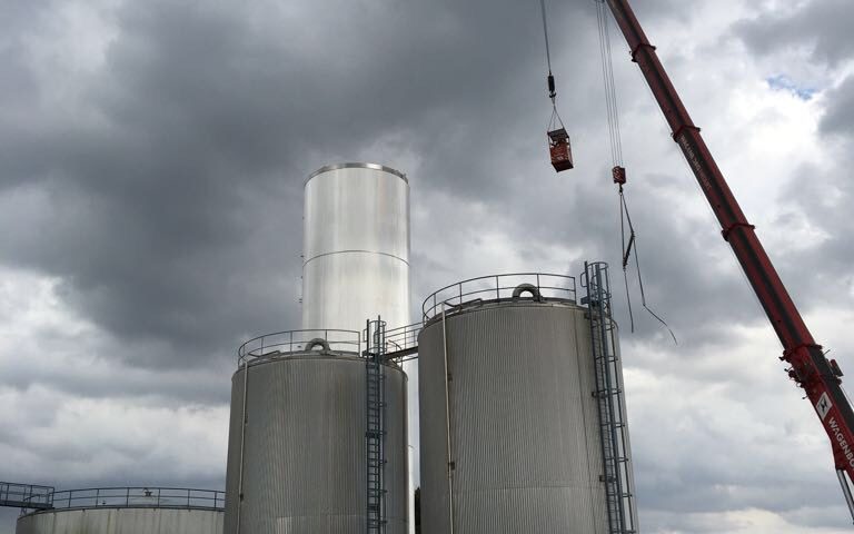 Op de achtergrond een van de nieuwe tanks, met een inhoud van 800.000 liter