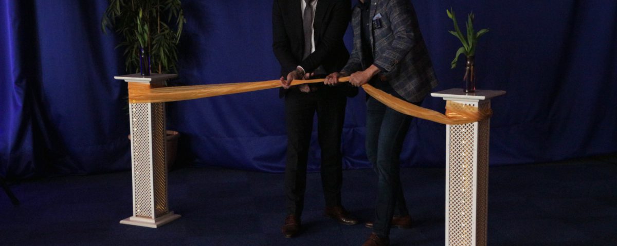 CEO Cas König van Groningen Seaports (l) en directeur Jelmer Spijksma van Or-Quest (r) openen op symbolische wijze de nieuwe vestiging van het detacheringsbureau in Delfzijl