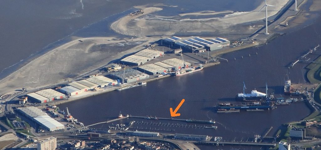 De handelshaven van Delfzijl. De oranje pijl laat zien waar de gerenoveerde drijvende steiger ligt.