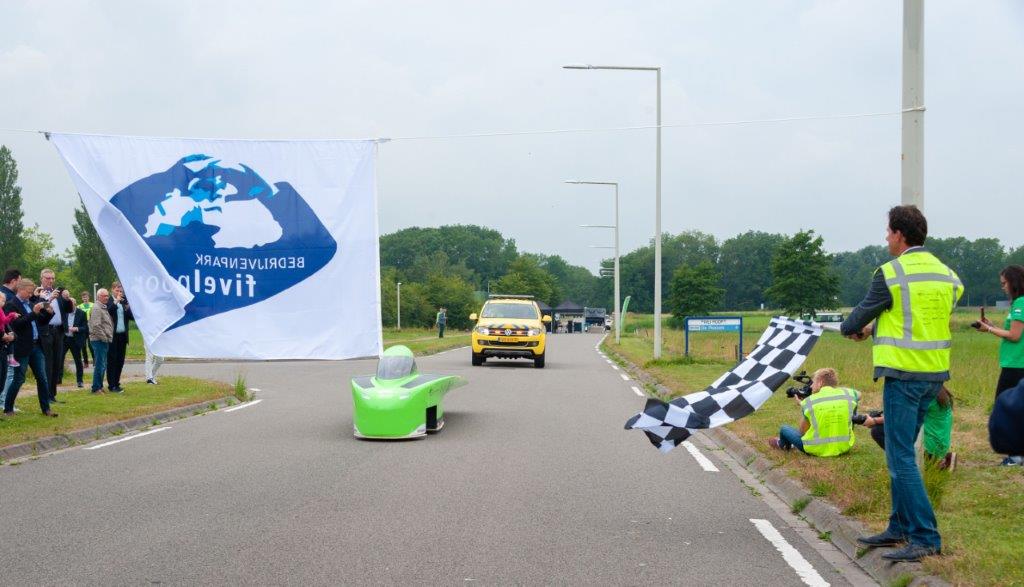 De zonneauto van Top Dutch Solar Racing Team wordt symbolisch afgevlagd op het testcircuit op Bedrijvenpark Fivelpoort en daarmee is de start van de testritten officieel een feit (foto Bedrijvenpark Fivelpoort)