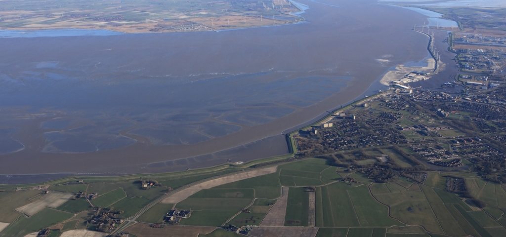 De Eems en de Dollard. Aan de rechterkant het haven- en industriegebied van Delfzijl.
