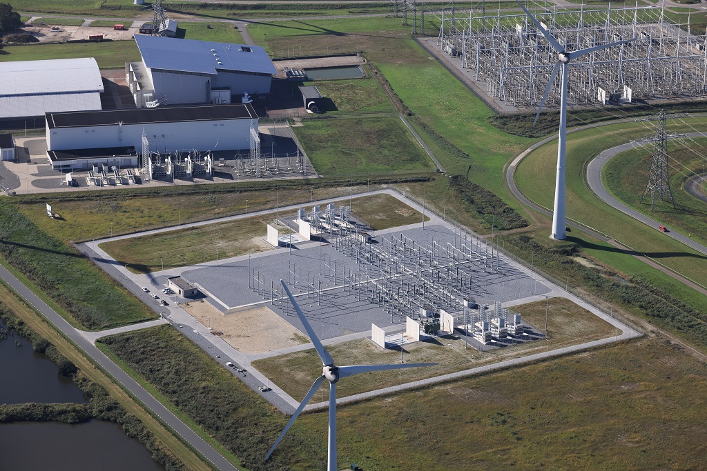 Het nieuwe compensatie- en filterstation van TenneT op de voorgrond. Daarachter Cobra en NorNed (links) en het schakelstation (rechts) (Foto Groningen Seaports)