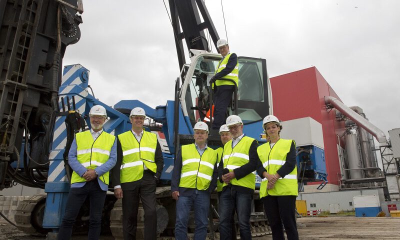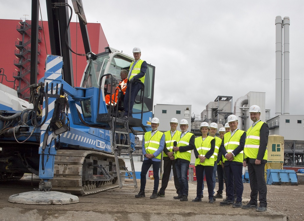 Gedeputeerde Rijzebol (staand bij de cabine) heeft zojuist de heimachine in werking gesteld voor het slaan van de eerste paal voor de bouw van de nieuw slibverwerkingsinstallatie. V.l.n.r: Wilfred de Jager (technische directeur EEW Delfzijl), Christian Funk, (financieel directeur EEW Delfzijl), Hans-Heinrich Baumert (bouwprojectleider), Inga Fischer (projectmanager), Henk Oost (bouwprojectleider), Bernard M. Kemper (CEO EEW-groep), dr. Joachim Manns (COO EEW-groep).