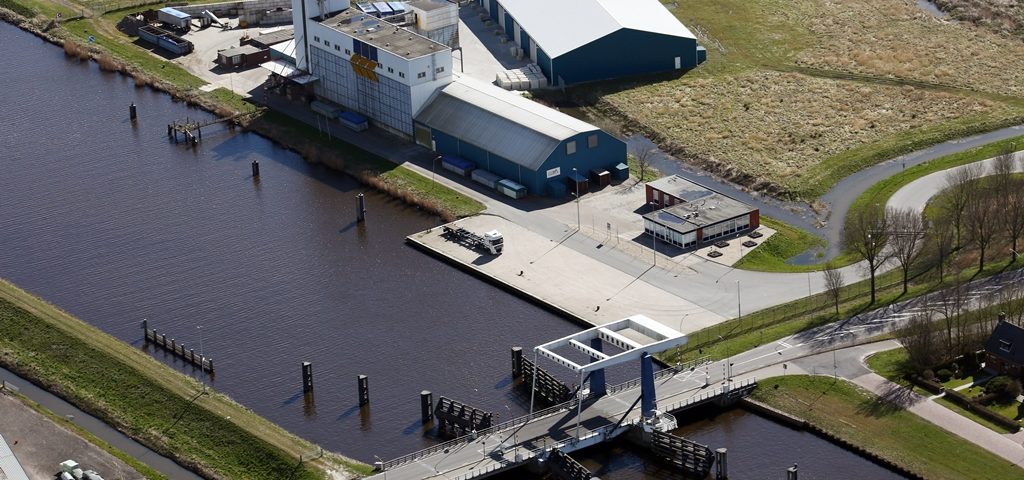 Het bedrijf Graansilo Appingedam en de kade van bedrijvenpark Fivelpoort. De geluidsscherm wordt geplaatst op de groene strook tussen het kadeterrein en de weg.