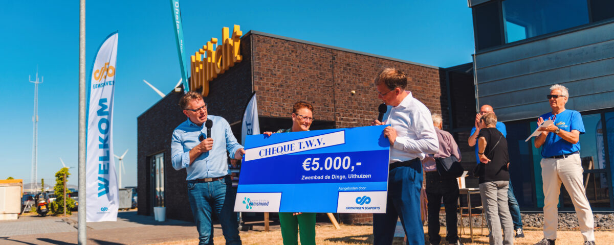 Groningen Seaports heeft afgelopen zaterdag 10 juni een cheque overhandigd ter waarde van €5.000,- aan Zwembad de Dinge in Uithuizen. Dit gebeurde tijdens de Open Dag Eemshaven. Harald Bouman, voorzitter Zwembaden Eemsmond, en medewerker Yvonne Lanting, namen de cheque in ontvangst. Laatstgenoemde heeft vroeger zelf in de Eemshaven gewerkt en werkt bij Zwembad de Dinge tegenwoordig achter de kassa/receptie.