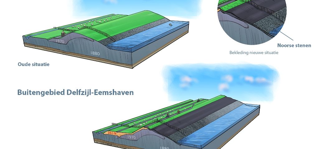 In opdracht van het waterschap Noorderzijlvest werkt combinatie Ommelanderdiek aan de Dijkverbetering Eemshaven – Delfzijl. Regelmatig informeert Noorderzijlvest de omgeving over de voortgang van het project. Op donderdag 7 en vrijdag 8 december heeft het waterschap een bewonersbrief verspreid met daarin de laatste stand van zaken en de eerste impressies van de basisontwerpen van de nieuwe dijk. Waterschap Noorderzijlvest publiceert de informatie met betrekking tot de dijkverbetering Eemshaven-Delfzijl ook op haar website.