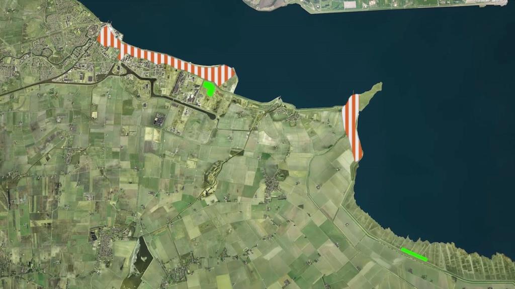 De rood-wit gearceerde gebieden geven de herkomst van het slib weer (Zeehavenkanaal en Polder Breebaart), de groene gebieden zijn de onderdelen van de Kleirijperij bij Delfzijl en langs de Dollarddijk