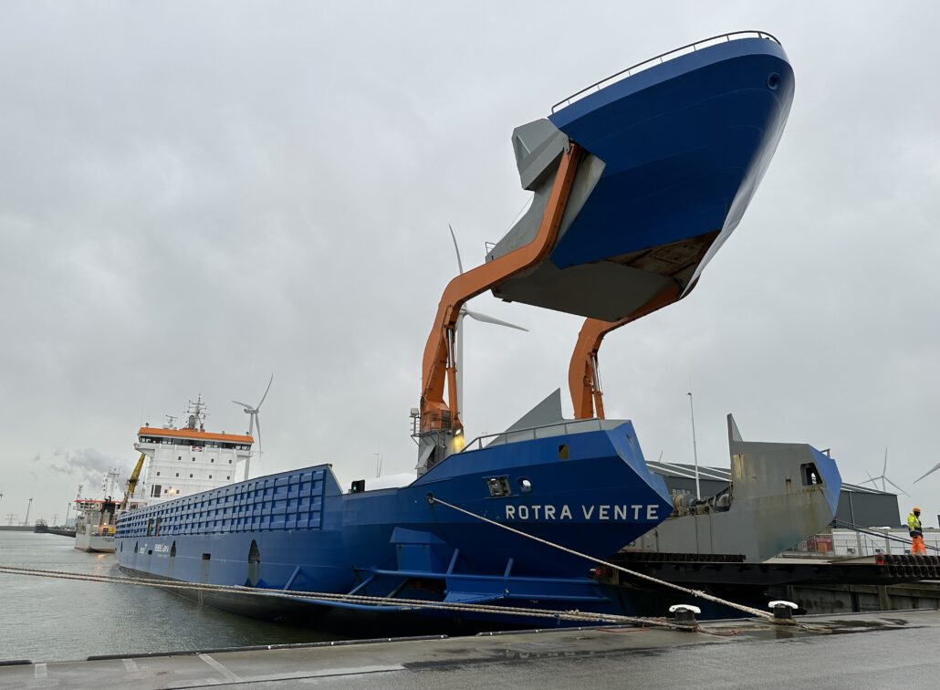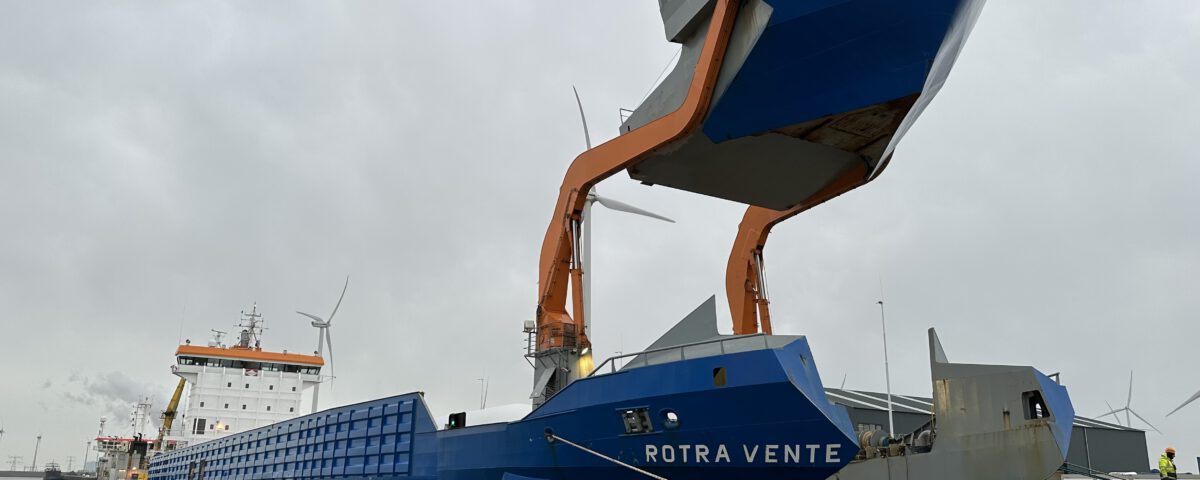 Bij Buss Terminal Eemshaven is de logistieke afhandeling van windpark Hollandse Kust Noord inmiddels in volle gang en dat is alweer het 19e windpark dat via de Eemshaven wordt geïnstalleerd. De afgelopen periode werden er al grote hoeveelheden torendelen voor de Siemens-windturbines aangevoerd. Hiervoor wordt o.a. gebruikt gemaakt van het schip Rotra Vente van rederij Amasus Shipping. Een bijzonder en spectaculair gezicht, omdat dit schip haar boeg kan openen en deze op hoogte kan brengen. Deze techniek maakt het mogelijk om het laden en lossen van de zwaarste windturbineonderdelen soepel te laten verlopen.
