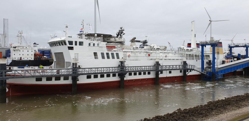 MS “Münsterland” afgemeerd bij de veerterminal van AG EMS in de Beatrixhaven (Foto AG EMS)