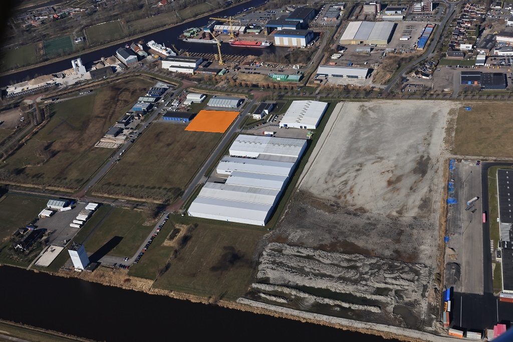 Het oranje vlak geeft de locatie van Eems Vastgoed en EemsDam op bedrijventerrein Farmsumerpoort weer (Foto Groningen Seaports / Koos Boertjens)