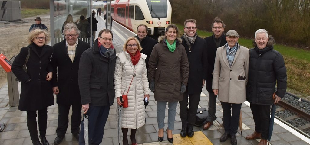 De aanwezige delegatie op het perron van het nieuwe station in Roodeschool (foto provincie Groningen)