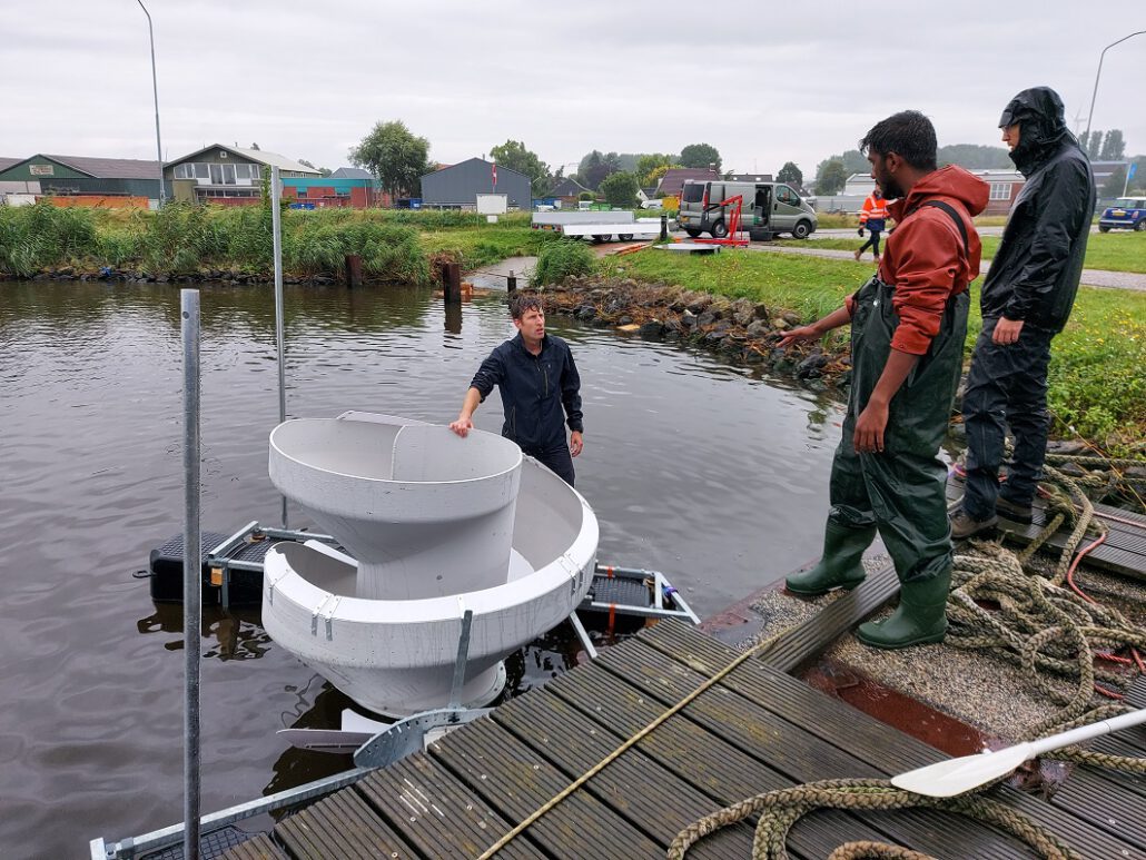 Er wordt druk overlegd tijdens het testen van Noria’s CanalCleaner in de Farmsumerhaven in Delfzijl (Foto Sophie Broere, Noria)