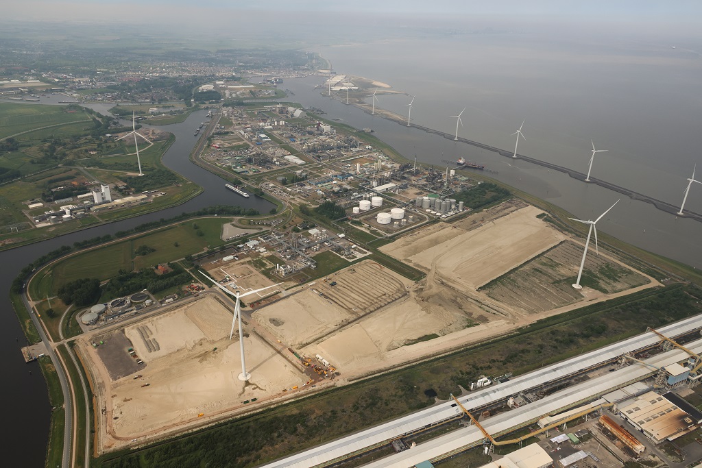 De ophoging van bedrijventerrein Heveskes in beeld. In het midden de locatie van Avantium. (Foto Groningen Seaports – Koos Boertjens)