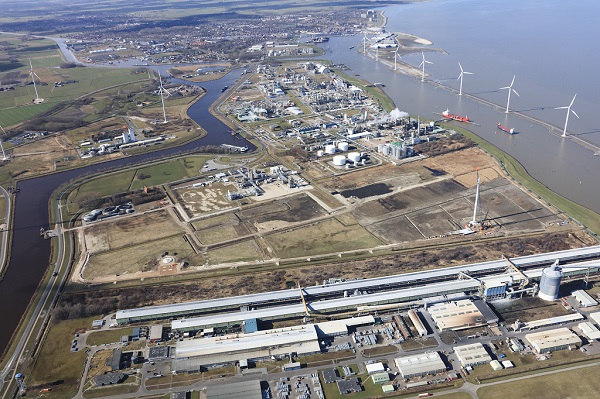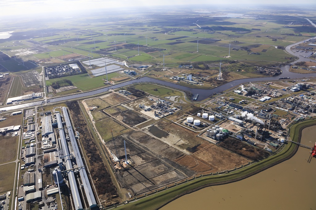 De ophogingswerkzaamheden op bedrijventerrein Heveskes tussen Aldel (l) en het Chemie Park Delfzijl (r) zijn begonnen
