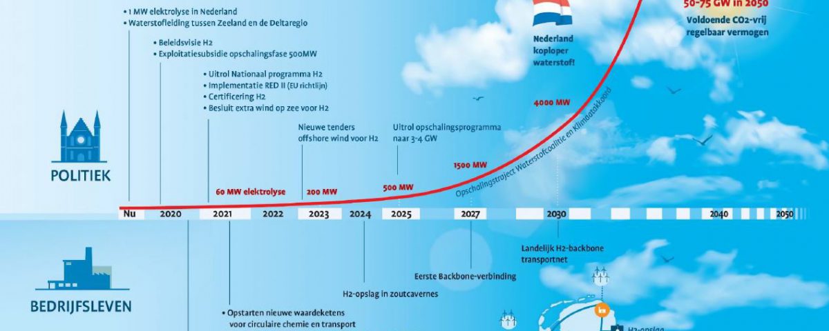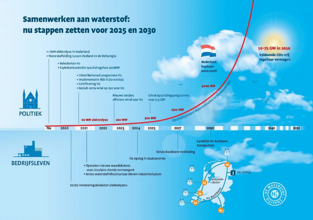 Op dit moment staat er 1 Megawatt schaal aan waterstof elektrolyse in Nederland. In 2025 moet er minstens 500 Megawatt opgesteld vermogen elektrolyse staan om de ambitie voor waterstof in het Klimaatakkoord te halen. Om de komende vijf jaar groene waterstof op te schalen moet de technologie meteen worden gestimuleerd. Dit betekent onder andere dat overheid en bedrijfsleven nu al actie moeten ondernemen. Deze eerste stap in de opschaling van groene waterstof biedt tevens voldoende perspectief voor de markt met zicht op 3-4 Gigawatt opgesteld vermogen in 2030. Daarmee blijven de klimaatdoelen binnen bereik.