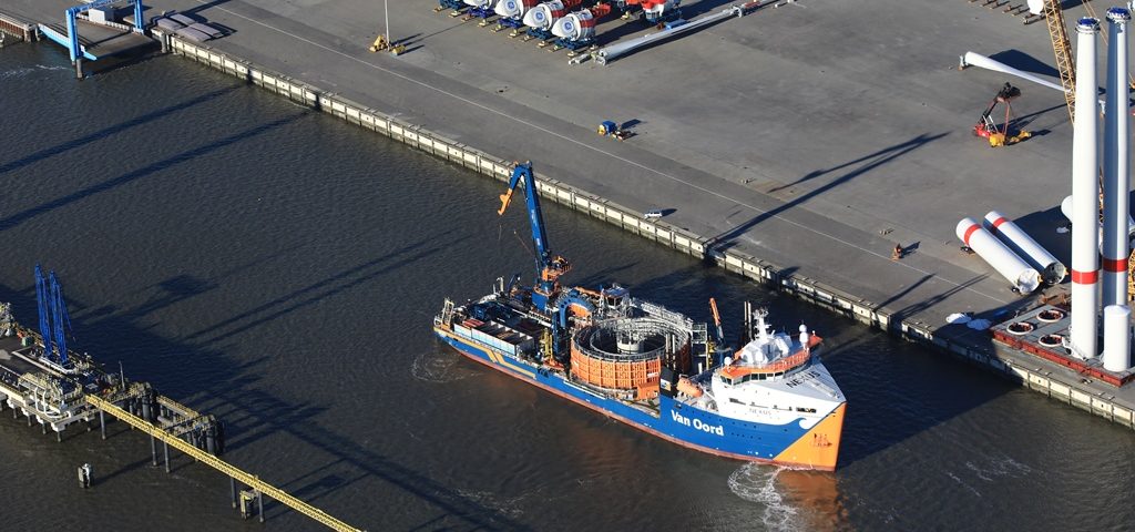 Archieffoto van kabellegger Nexus in de Eemshaven. Het schip ligt zaterdag afgemeerd aan de Beatrixkade bij Wijnne Barends.
