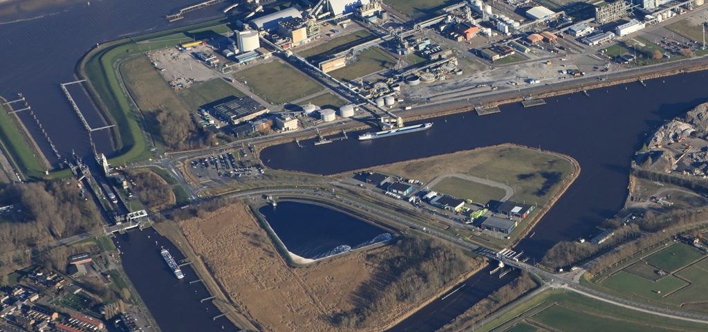 Links het zeesluizencomplex nabij Farmsum. Op deze foto staat de buitenhoofdbrug open om een binnenvaartschip door te laten en is de binnenhoofdbrug (N991) toegankelijk voor het wegverkeer. Precies zoals dat in de nacht van 12 op 13 juli ook het geval zal zijn.