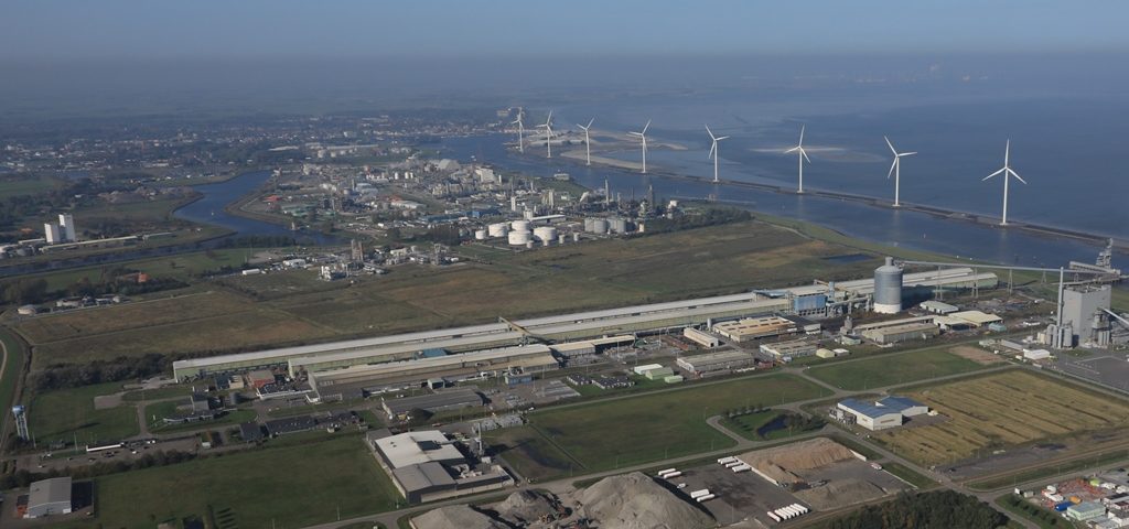 In het midden de aluminiumfabriek Aldel dat onder de nieuwe naam DAMCO Aluminium Delfzijl een doorstart maakt