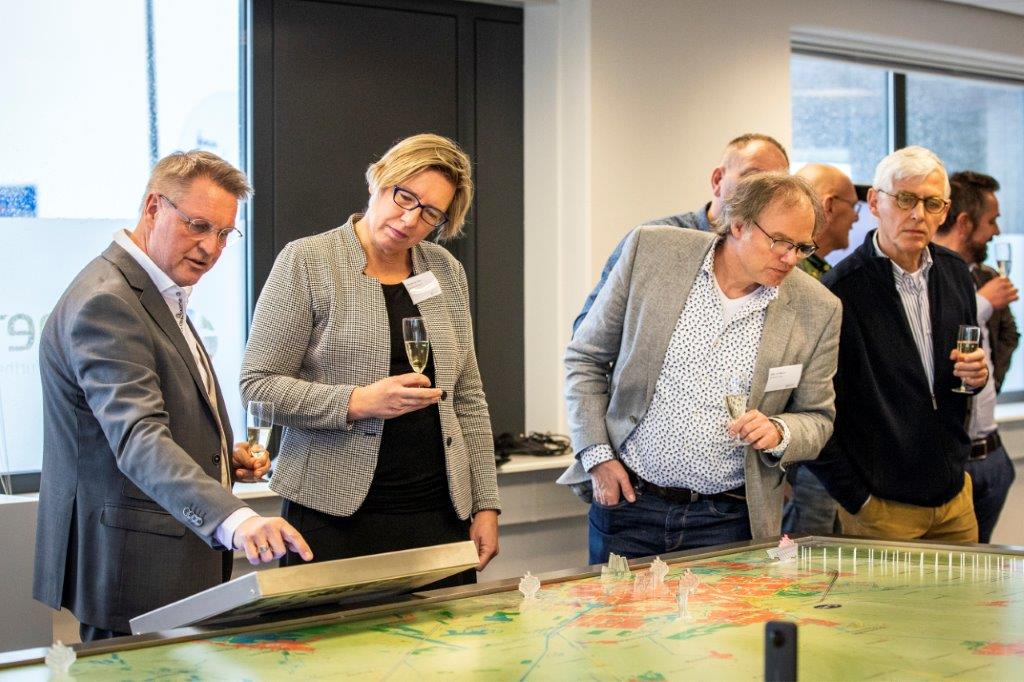 Tijdens de opening van het TenneT Informatiecentrum bekijken een aantal genodigden de maquette