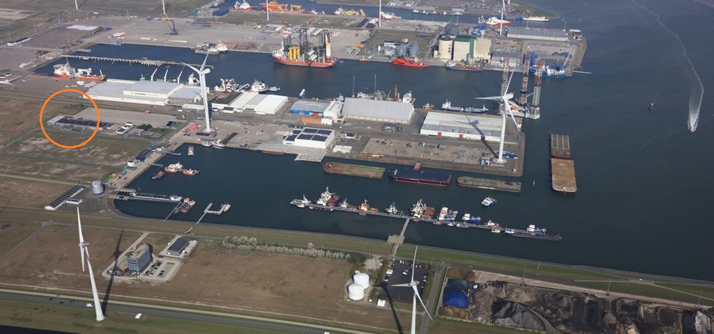 De Eemshaven met in de oranje cirkel de locatie van Unishore