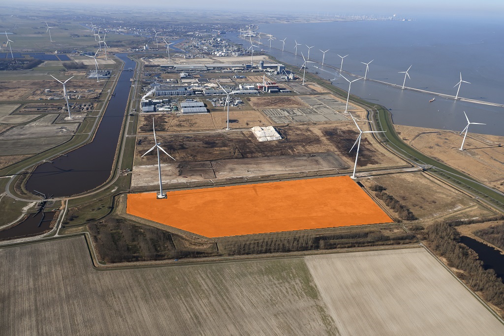 Het oranje gearceerde gebied geeft de locatie van het Zonnepark Valgenweg weer (Foto Groningen Seaports – Koos Boertjens)