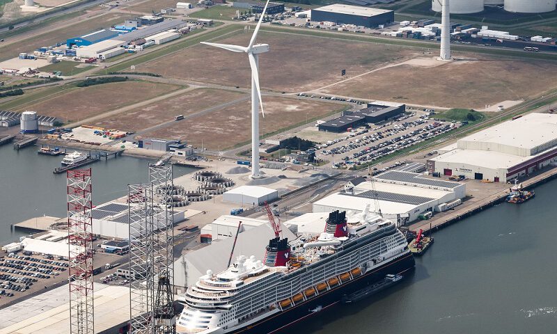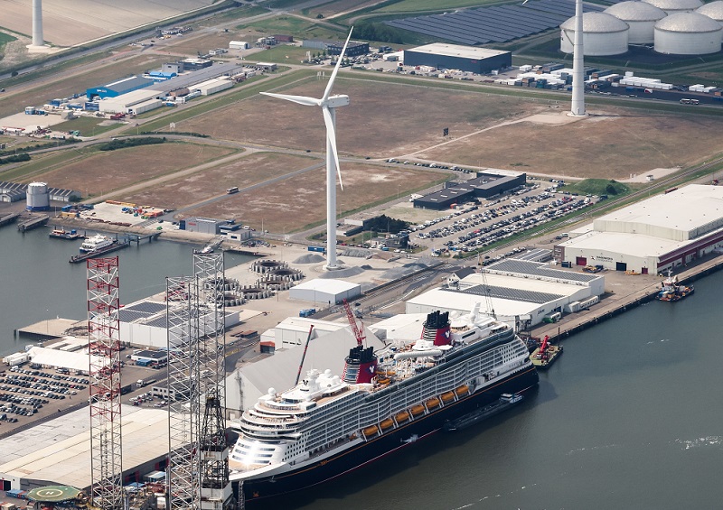 In het midden van de foto de windturbine van RWE die een technische upgrade ondergaat (Foto Groningen Seaports – Koos Boertjens)