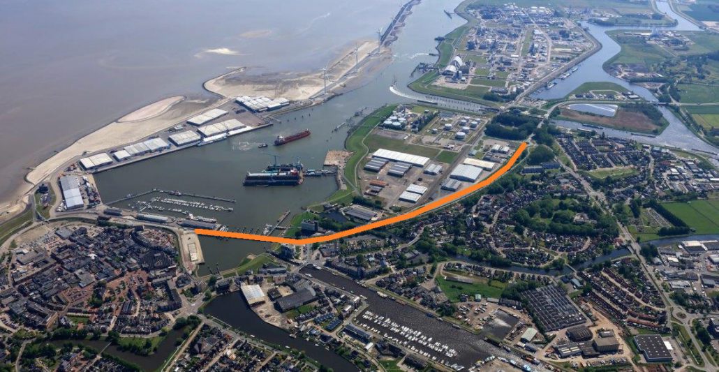 De oranje lijn geeft het gedeelte van de Oosterveldweg in Delfzijl weer waaraan de wegwerkzaamheden plaatsvinden
