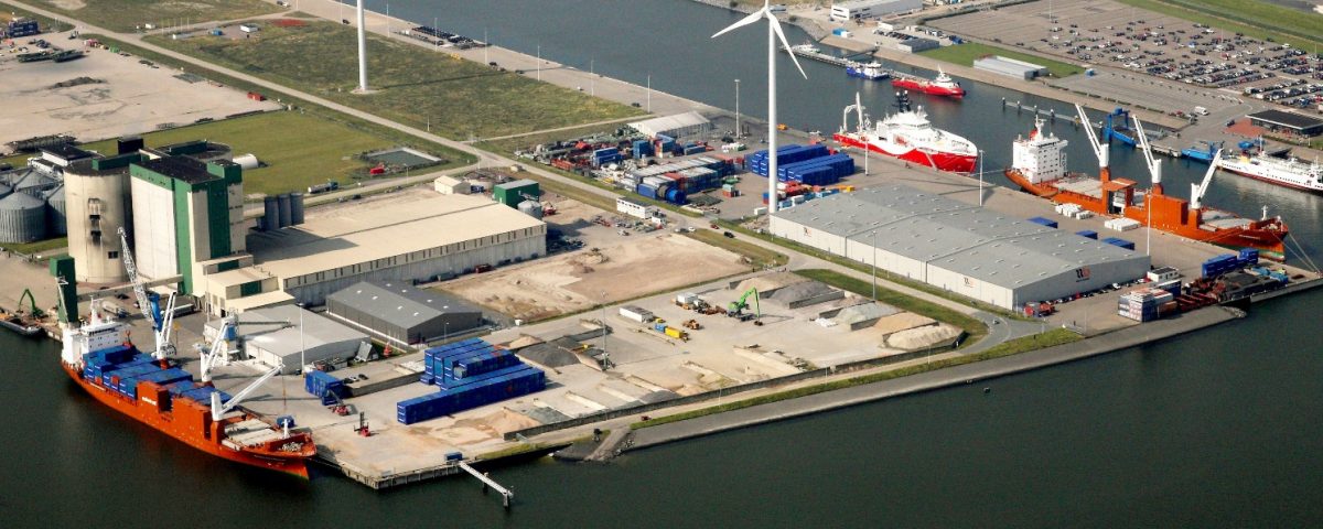 De locatie Eemshaven waar 2 Spliethoff schepen laden. Links Julianahaven, rechts Beatrixhaven.