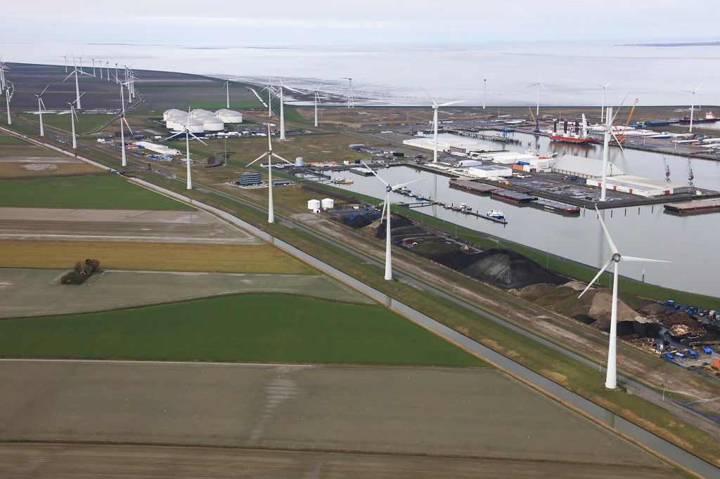 Een aantal windturbines langs de Kwelderweg in de Eemshaven die worden vervangen (foto Groningen Seaports)