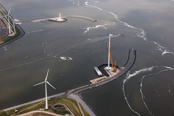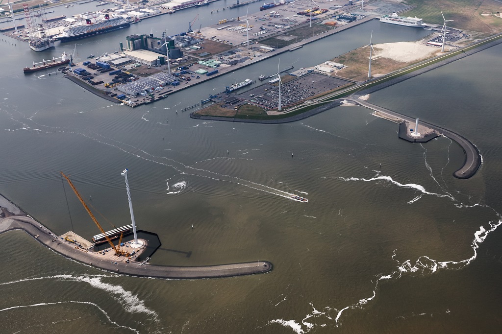 De twee windturbines naast de beide strekdammen van de Eemshaven in aanbouw (Foto Groningen Seaports – Koos Boertjens)